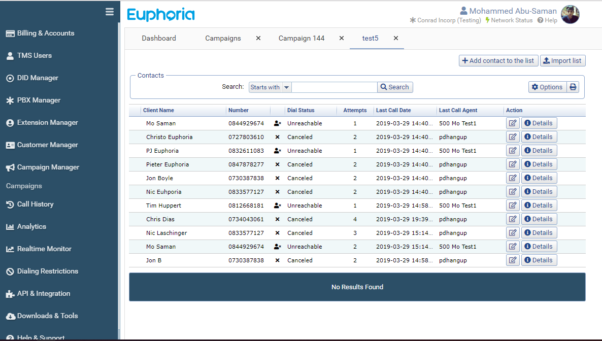 Call center system that accepts a list of contacts with phone numbers and sends these contacts as calls to the agents (integrates with the agent workspace platform)